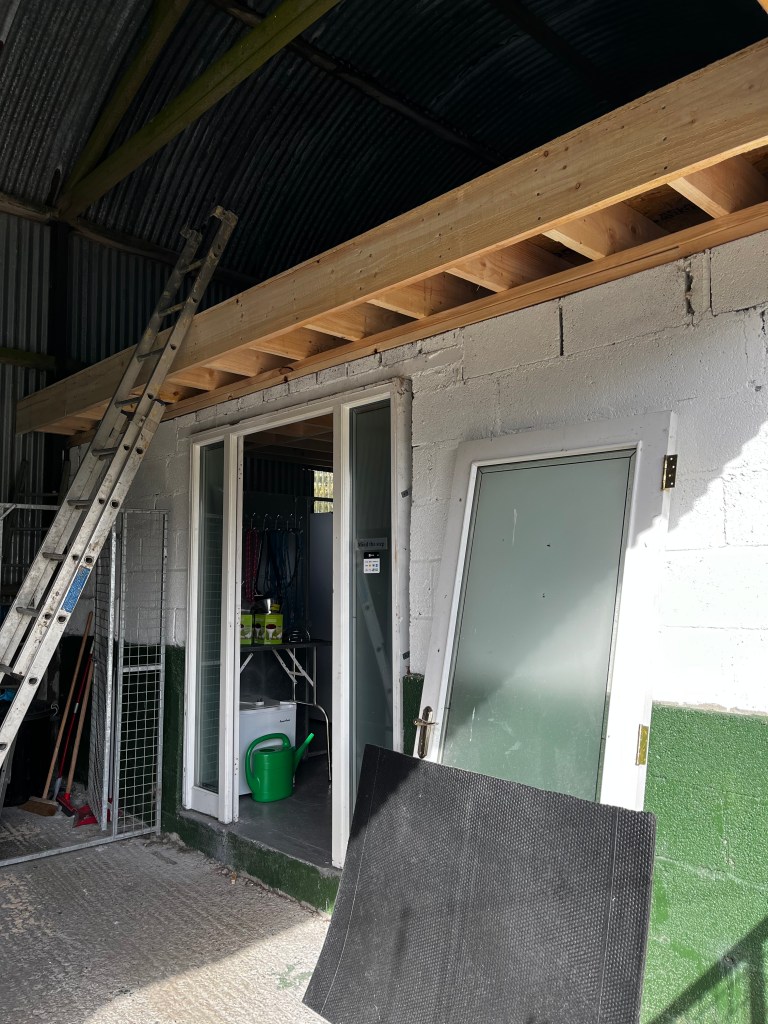 Due to unforseen circumstances, it has taken longer than planned to get the ceiling in but we’re finally there, so now the door is going on and it will be warm for winter.