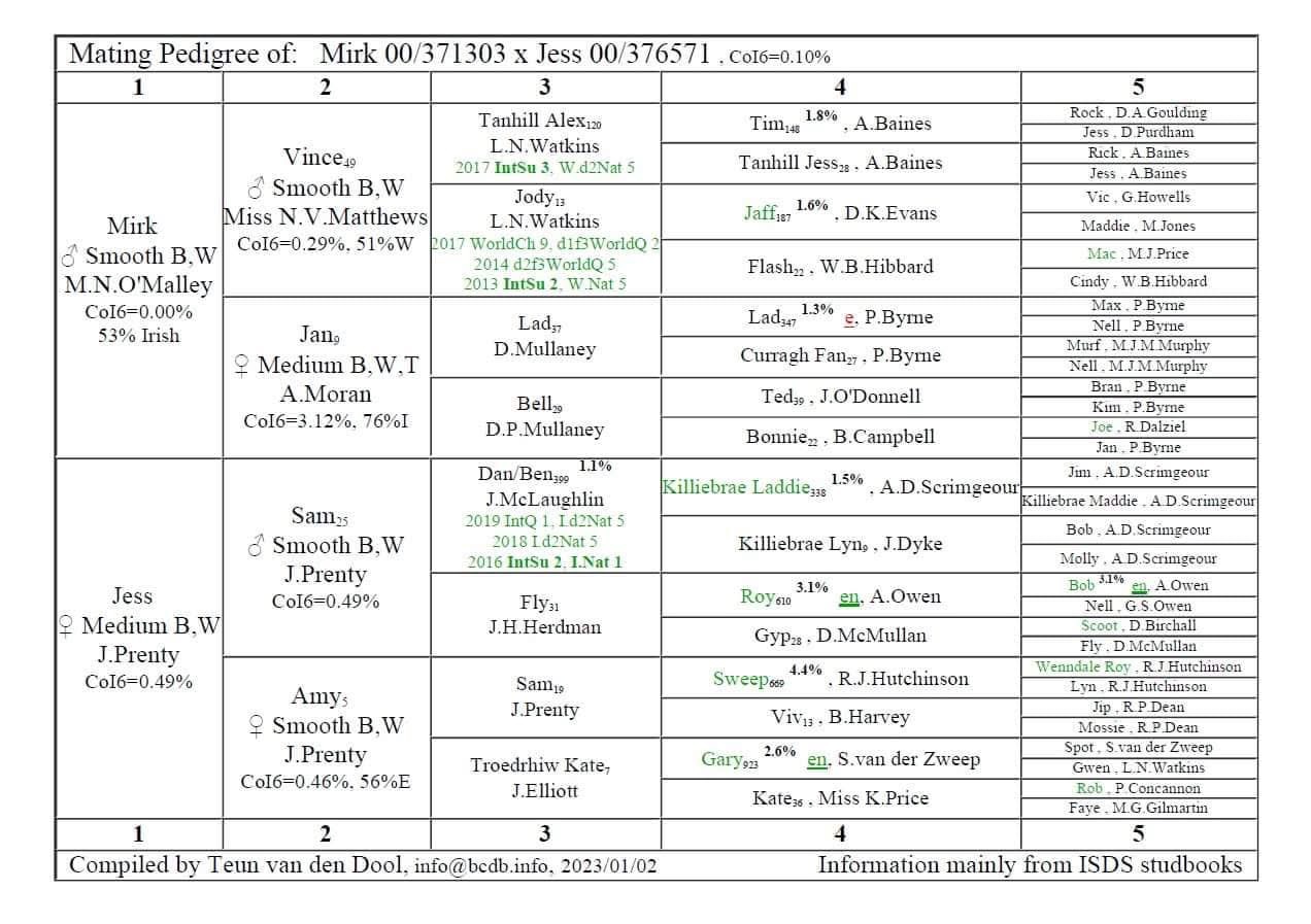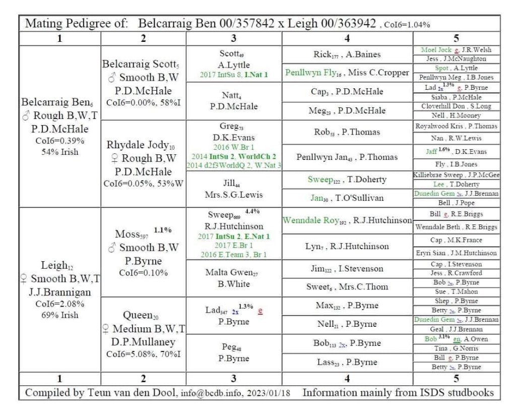 Puppies from Arjan’s Zel (M Baranski’s Treasured Til x Roca Lila) X Arjan’s Ben (M O’Malley’s Mirk x James Prenty’s Jess). Both bitch and dog can be seen at home.